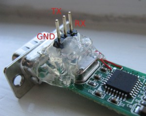 Next, I soldered ground, RX, and TX wires from the FTDI chip to a pin header. I find it works best to put a little extra solder on the pins/pads and then apply heat above the wire until it melts into the solder on top of the pin. Below is a picture of the header and the three wires. The header isn’t connected to the serial port below, it’s actually floating above it.